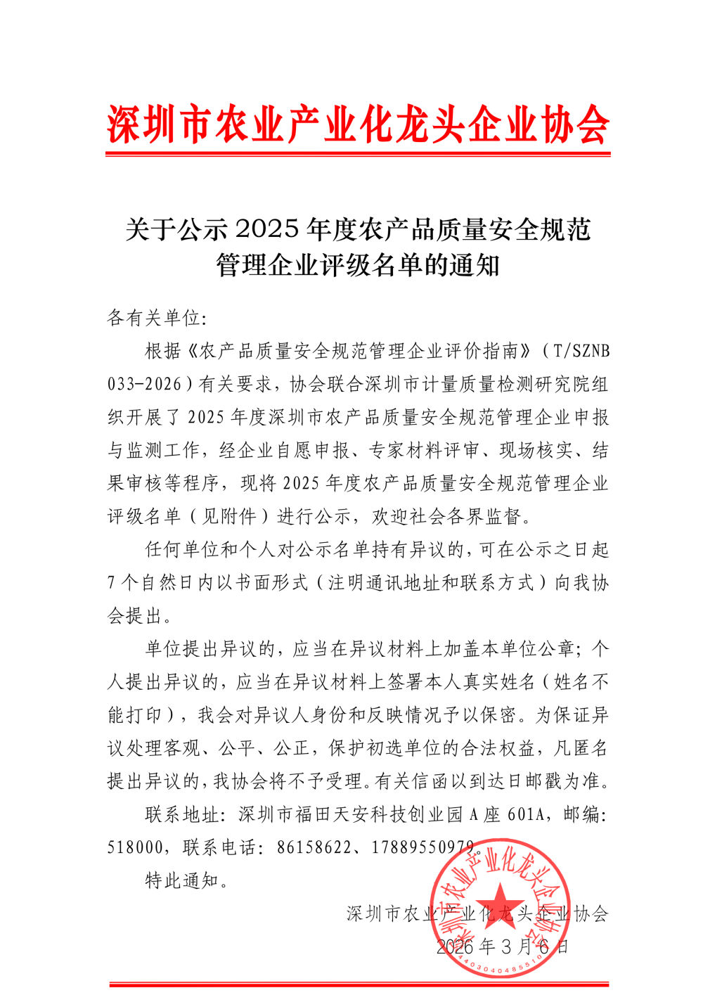 近日,深圳市农业产业化龙头企业协会正式公示2025年度农产品质量安全规范管理企业评级名单,供广深圳肉类智能交易市场凭借严苛的全链条质量管控、先进的智能运营模式及突出的行业引领作用,成功获评AAA级企业,以标杆之力践行责任担当,为深圳农产品质量安全体系建设注入强劲动能。