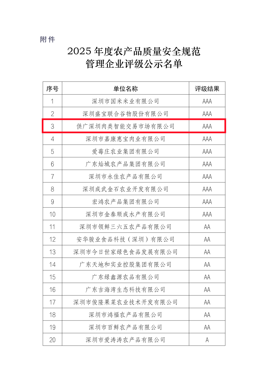 近日,深圳市农业产业化龙头企业协会正式公示2025年度农产品质量安全规范管理企业评级名单,供广深圳肉类智能交易市场凭借严苛的全链条质量管控、先进的智能运营模式及突出的行业引领作用,成功获评AAA级企业,以标杆之力践行责任担当,为深圳农产品质量安全体系建设注入强劲动能。